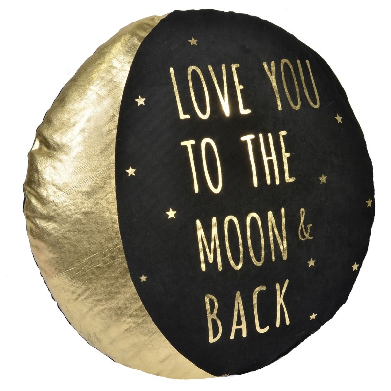 Кръгла декоративна възглавница, изработена от полиестер в черен цвят със златиста щампа на луна и звезди и надпис Love you to the moon & back.