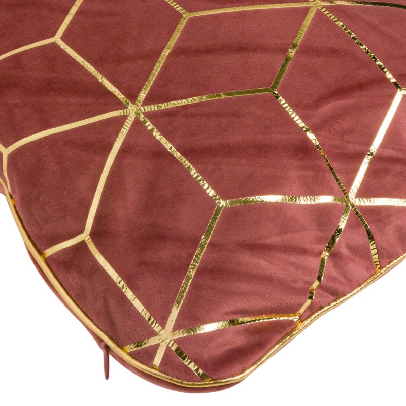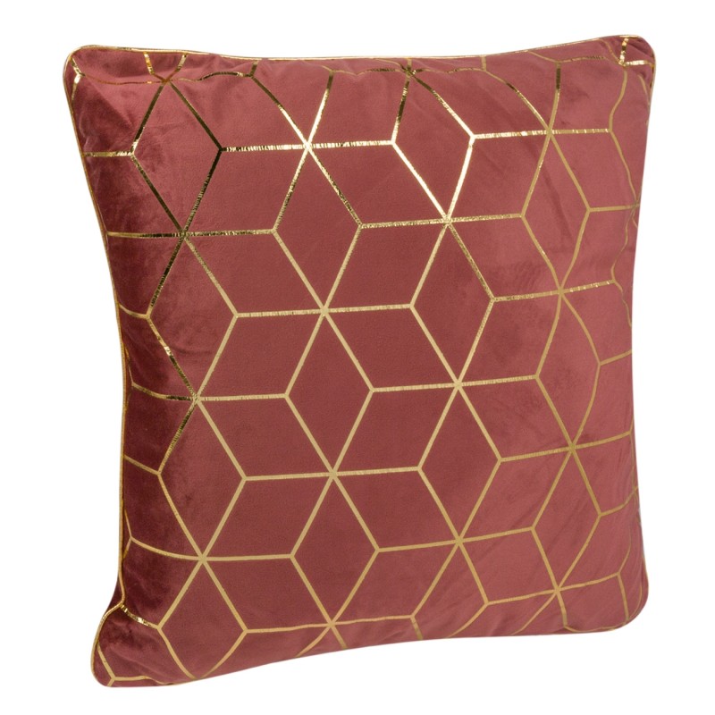 Декоративна възглавница, изработена от полиестер в цвят бордо със златисти ромбоидни шарки и цип.