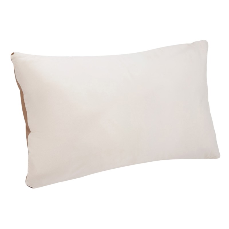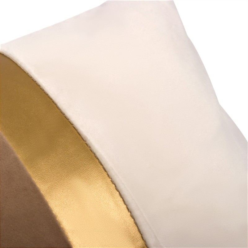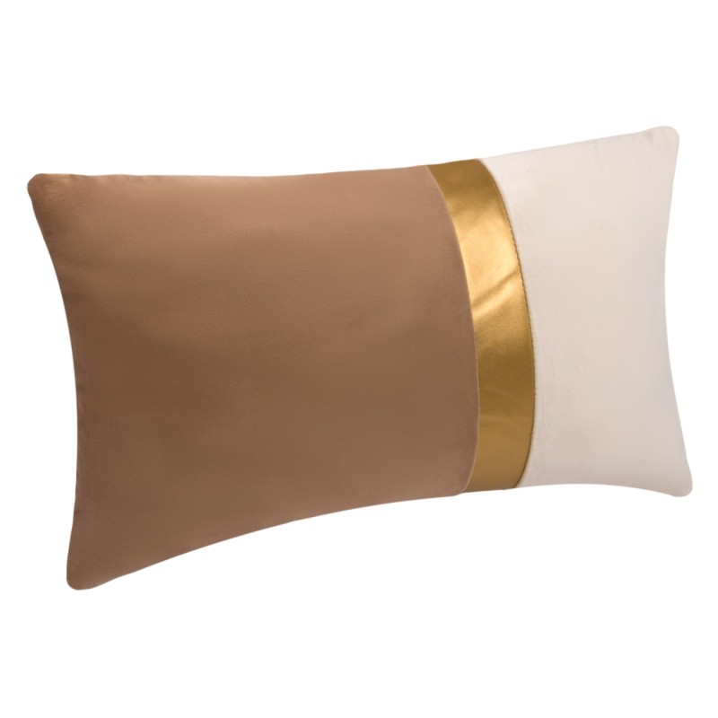 Правоъгълна декоративна възглавница, изработена от полиестер в бежово, златисто и бяло с цип.