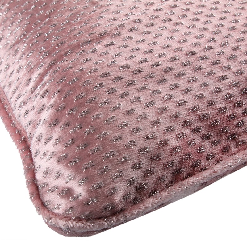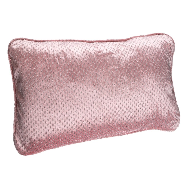 Правоъгълна декоративна възглавница, изработена от полиестер в розов цвят със сребристи нишки и цип.