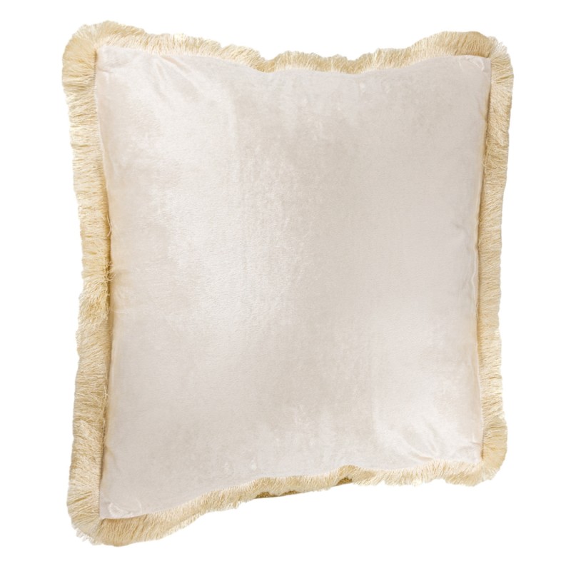 Декоративна възглавница, изработена от полиестер в бял цвят с цип и обрамчена с ресни в цвят екрю.