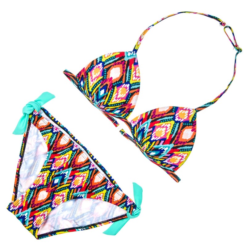 Детски бански костюм от 2 части - горнище и долнище за момиче с многоцветни шарки.