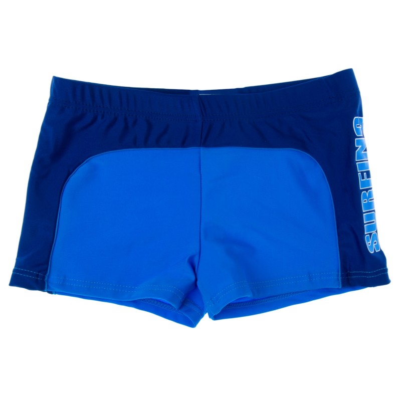 Детски бански костюм за момче в син цвят с тъмно сини кантове и надпис Surfing отстрани.