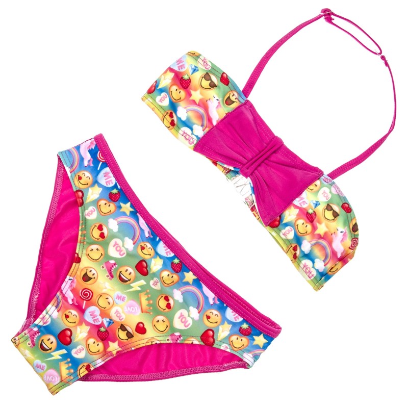 Детски бански костюм от 2 части - горнище и долнище за момиче в розов цвят с многоцветен принт на различни емотикони.
