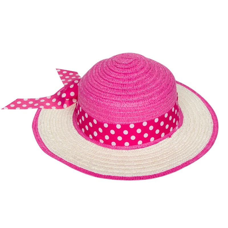 Детска капела в розов цвят с бяла периферия и розова панделка на бели точки.