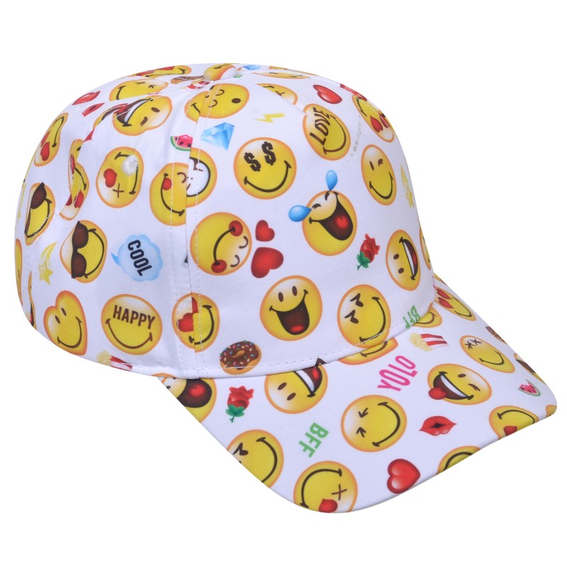 Детска шапка в бял цвят с козирка и картинки на различни емотикони.