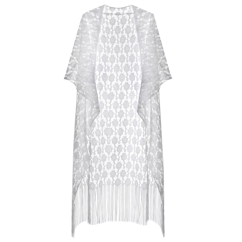 Детски кафтан с ръкави в бял цвят с красива дантела и ресни.