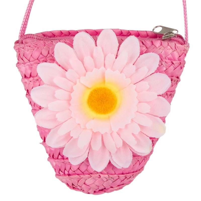 Детска плажна чанта от ратан в розов цвят с голяма маргаритка от плат.