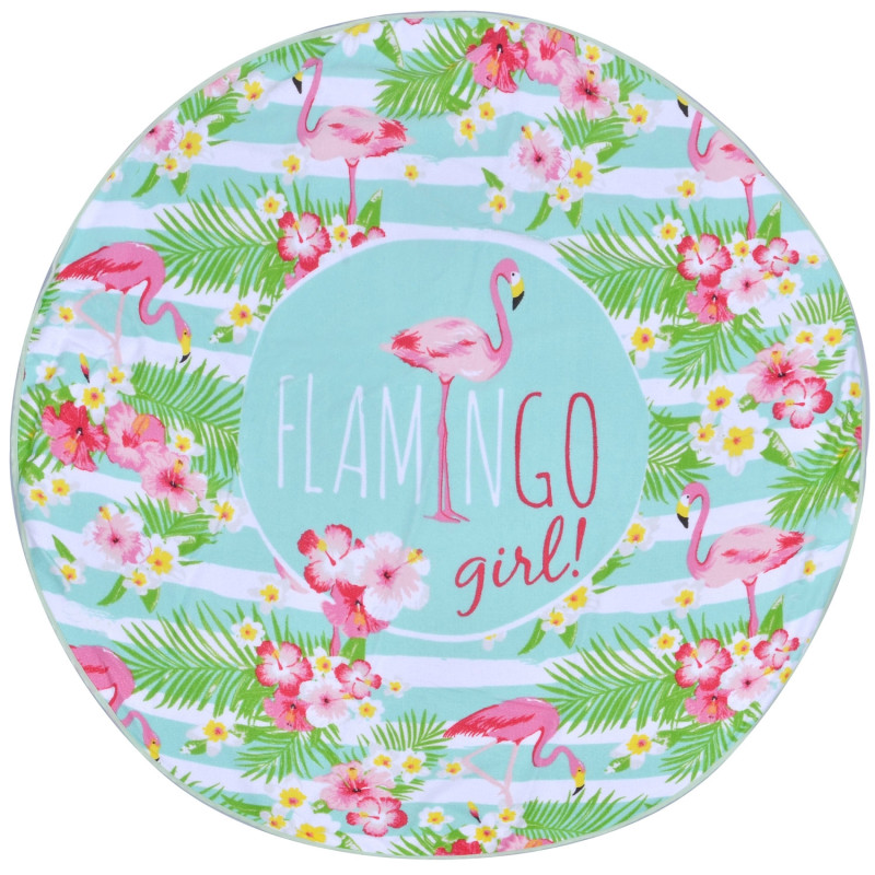 Кърпата е с ефектна кръгла форма и ярки цветове за неповторими моменти на плажа или край басейна.