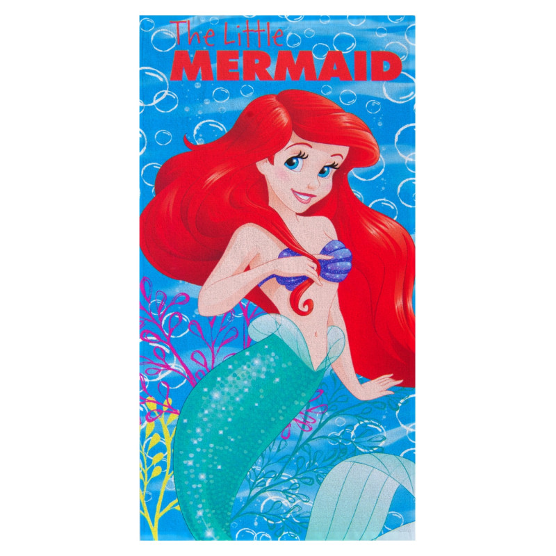 Детска хавлиена кърпа за плаж в син цвят с красива щампа на Малката русалка Ариел, която ще зарадва всяко малко момиче.