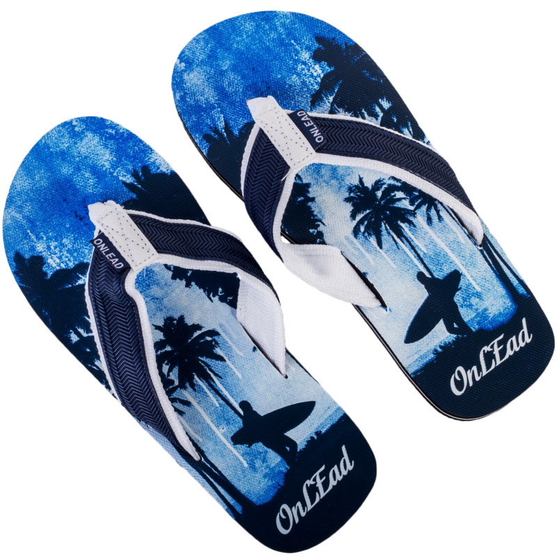 Детски джапанки в син цвят с ефектна щампа на сърфист и палми и сини каишки.