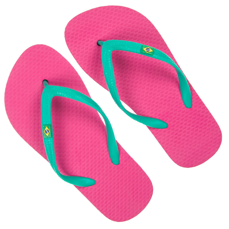 Детски джапанки в цикламен цвят със зелени каишки с бразилското знаме.