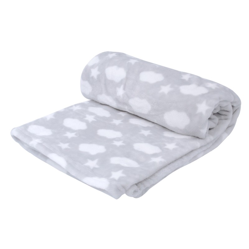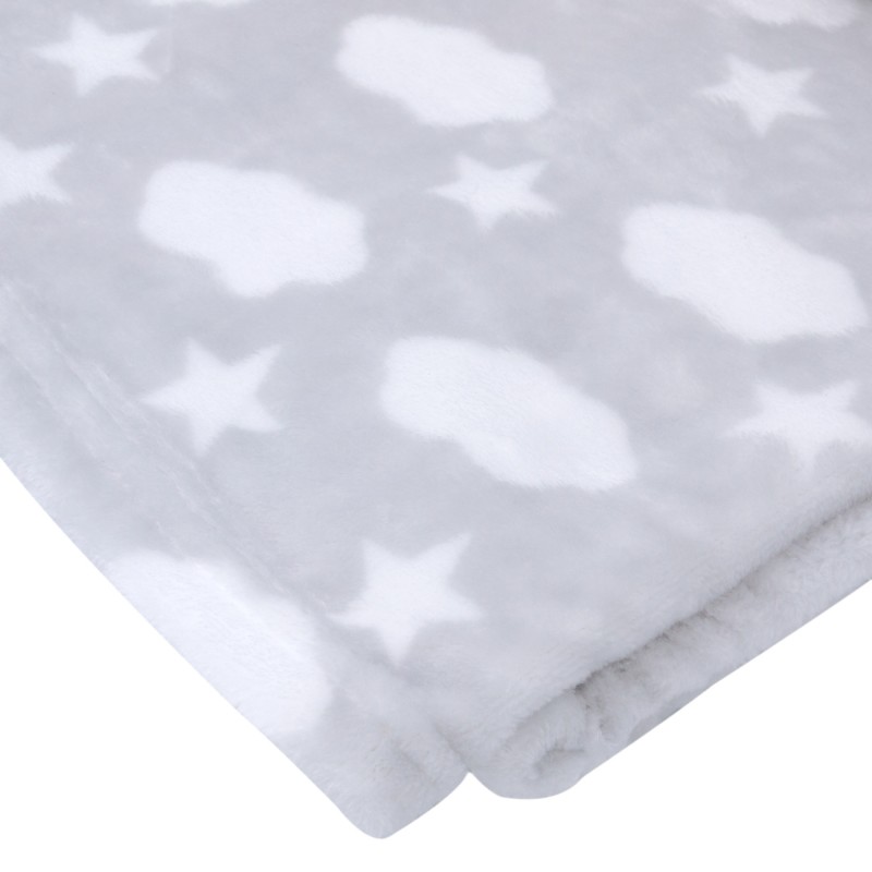 Покривка за бебешко легло, изработена от висококачествен и мек полиестер в сив цвят с принт на звезди и облаци.