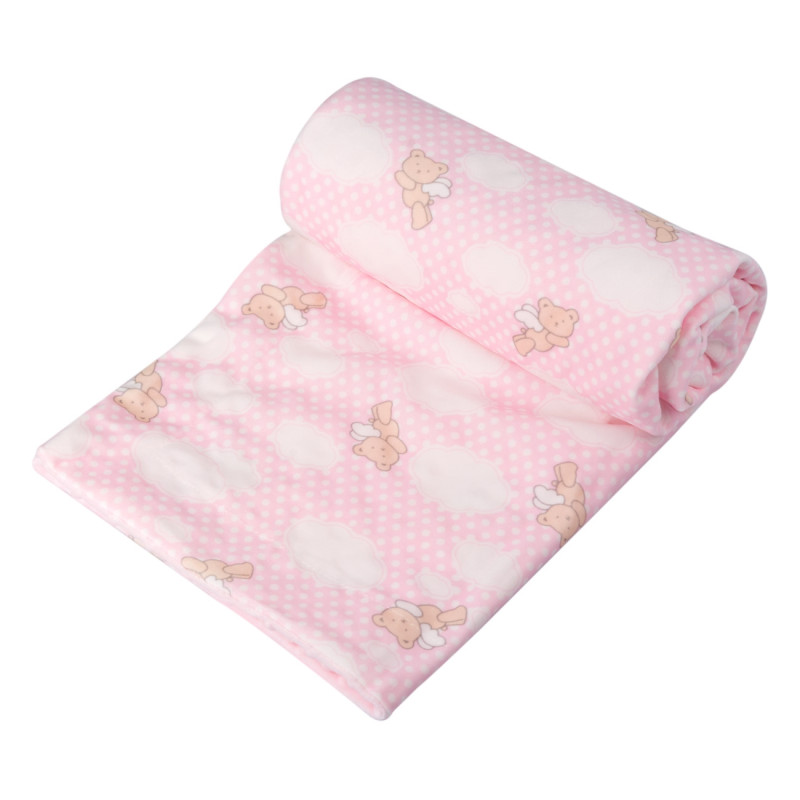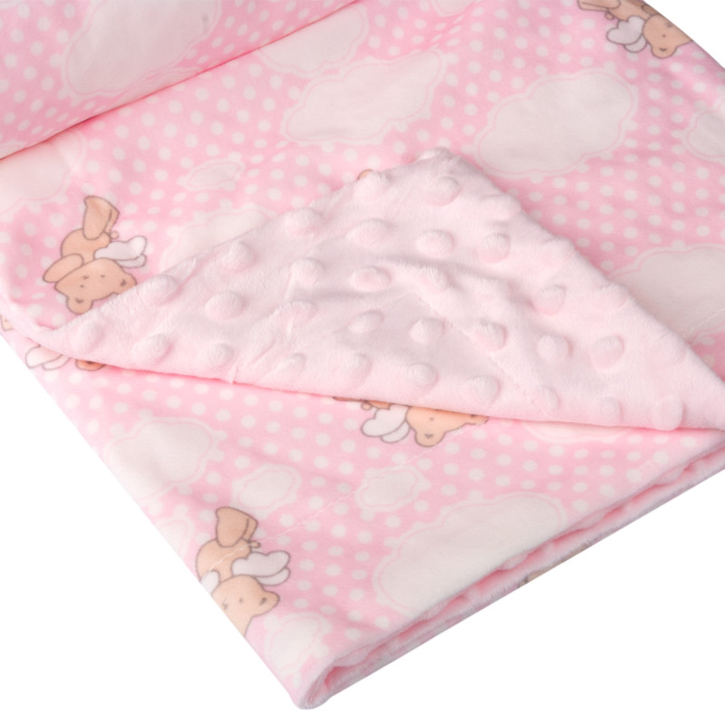 Шалте за бебешко легло, изработено от качествен и устойчив полиестер с две лица - принт на мечета и облаци и розово с релефни точки.