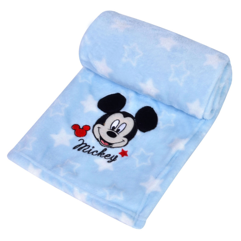 Покривка за бебешко легло, изработена от висококачествен и мек полиестер в светло син цвят с принт на звезди и бродерия на любимия анимационен герой на всяко дете - Мики Маус.