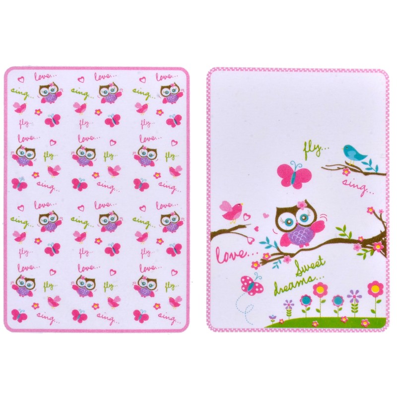Непромокаема подложка за бебешко легло, изработена от памук и полиестер в бял цвят с щампа на симпатична сова и розов кант.