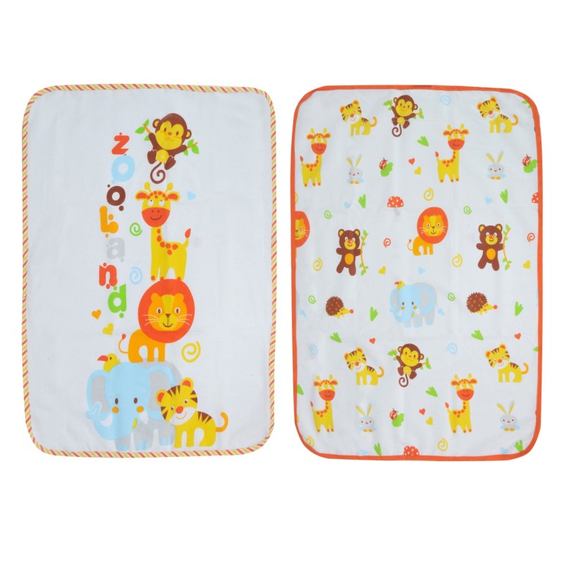Непромокаема подложка за бебешко легло, изработена от памук и полиестер в бял цвят с щампа на животните от джунглата и цветен кант.