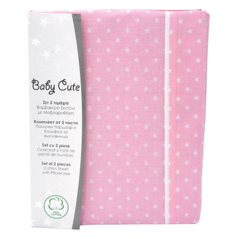 Долен чаршаф за детско легло с калъфка, изработени от висококачествено памучно трико в розов цвят с принт на звезди.