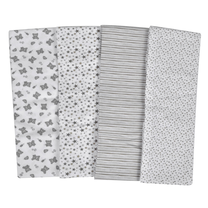 Комплект от 4 броя бебешка фланелена пелена с различни десени в бежови нюанси - райе, звезди, точки и мечета.