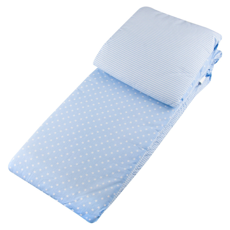 Обиколник за бебешко легло изработен от памук и полиестер в светло син цвят с принт на звезди и райе, подходящ за новородени бебета.