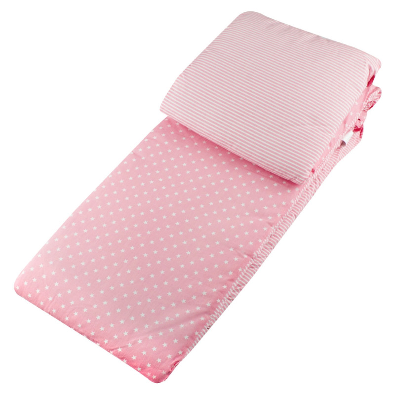Обиколник за бебешко легло изработен от памук и полиестер в розов цвят с принт на звезди и райе, подходящ за новородени бебета.