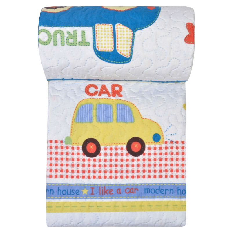 Покривка тип шалте за детско легло, изработена от микрофибърни влакна с цветен принт на автомобили.