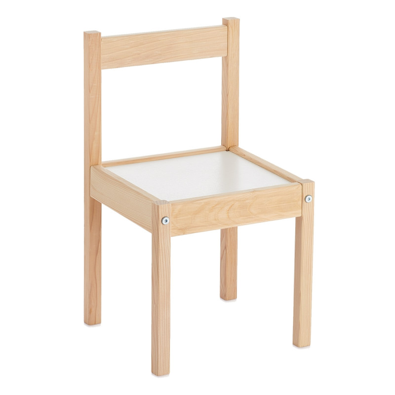 Функционално детско столче, изработено от качествена дървесина в естествен цвят с бяла седалка без подлакътници.