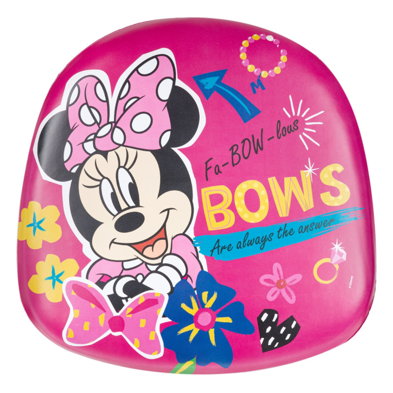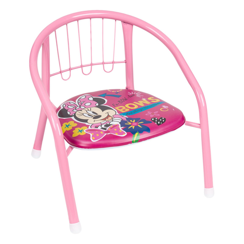 Детски стол със стабилна метална рамка в розов цвят и противоплъзгащи подложки на краката. Седалката е мека и удобна с цветна щампа на любимата анимационна героиня Мини Маус.