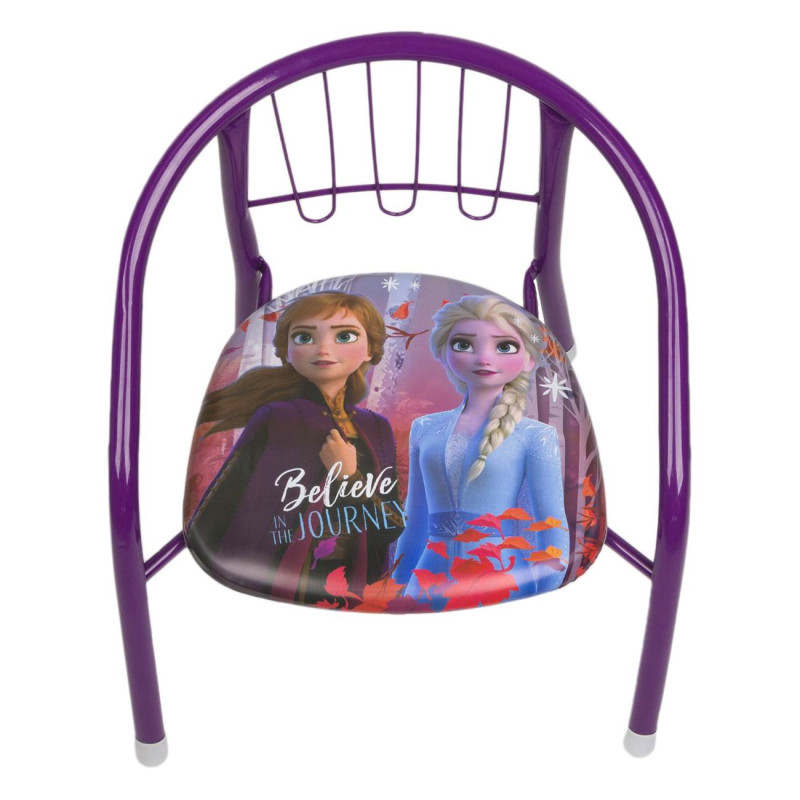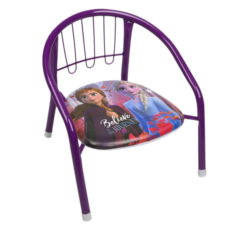Детски стол със стабилна метална рамка в лилав цвят и противоплъзгащи подложки на краката. Седалката е мека и удобна с цветна щампа на Елза и Анна от Замръзналото кралство.