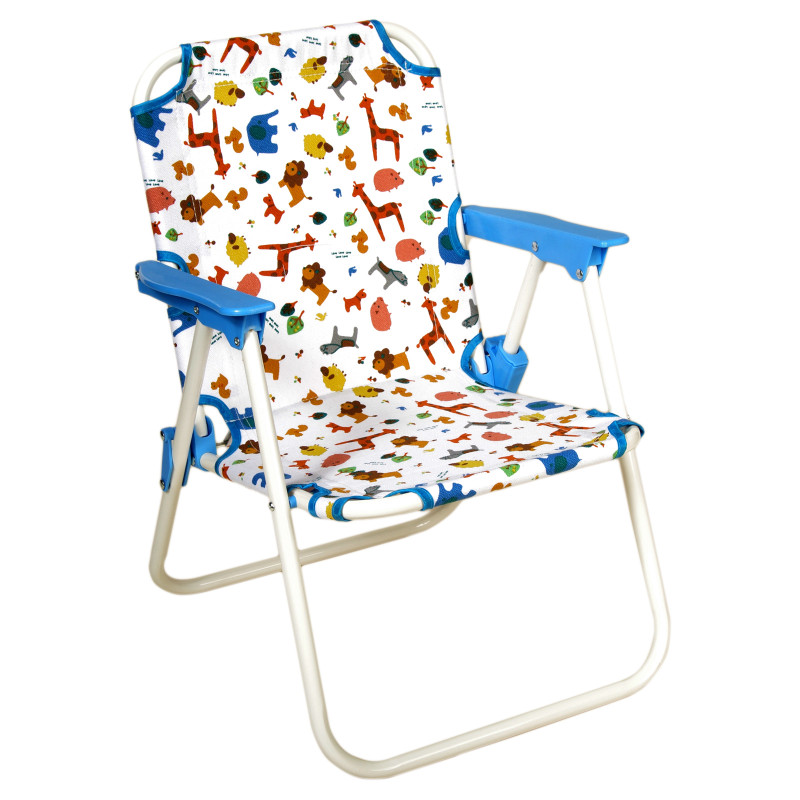Удобно детско столче тип шезлонг с метална рамка в бяло и синьо и здрав плат с принт на животни.