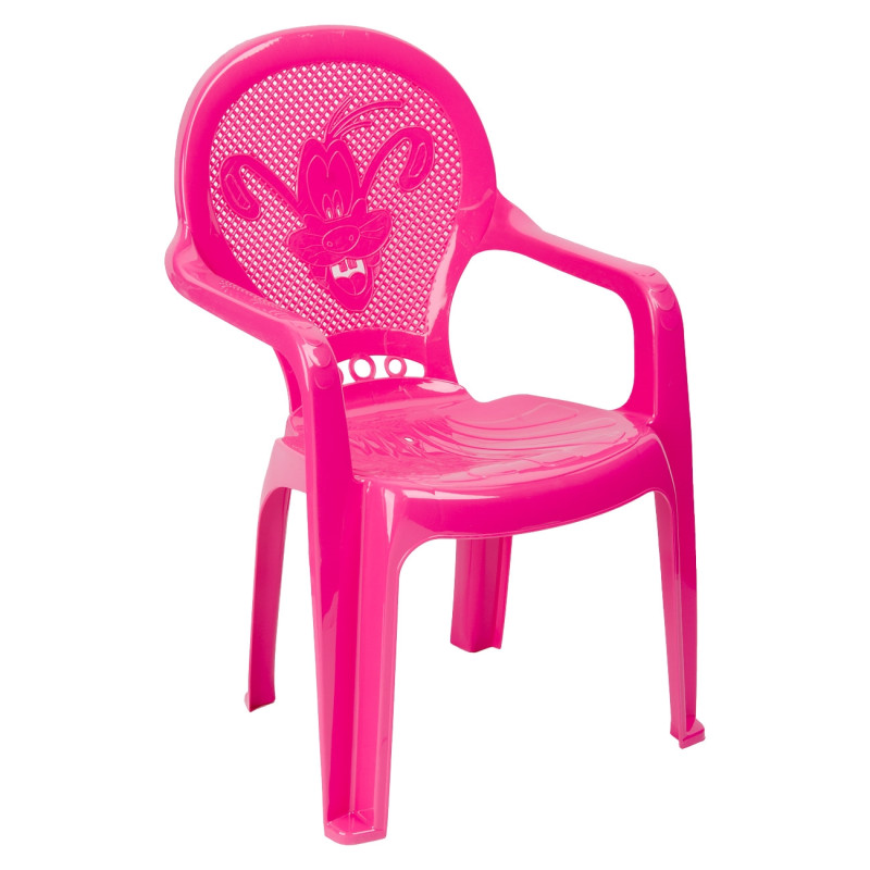 Универсално детско столче, изработено от устойчива и безвредна пластмаса в цикламен цвят с облегалка декорирана с картинка на Гуфи.