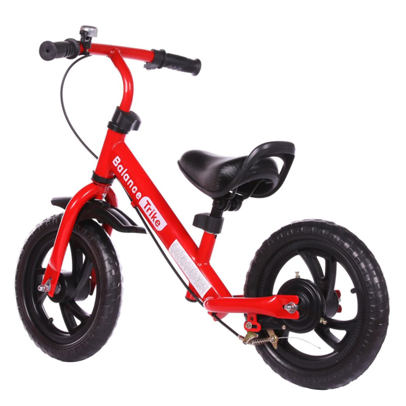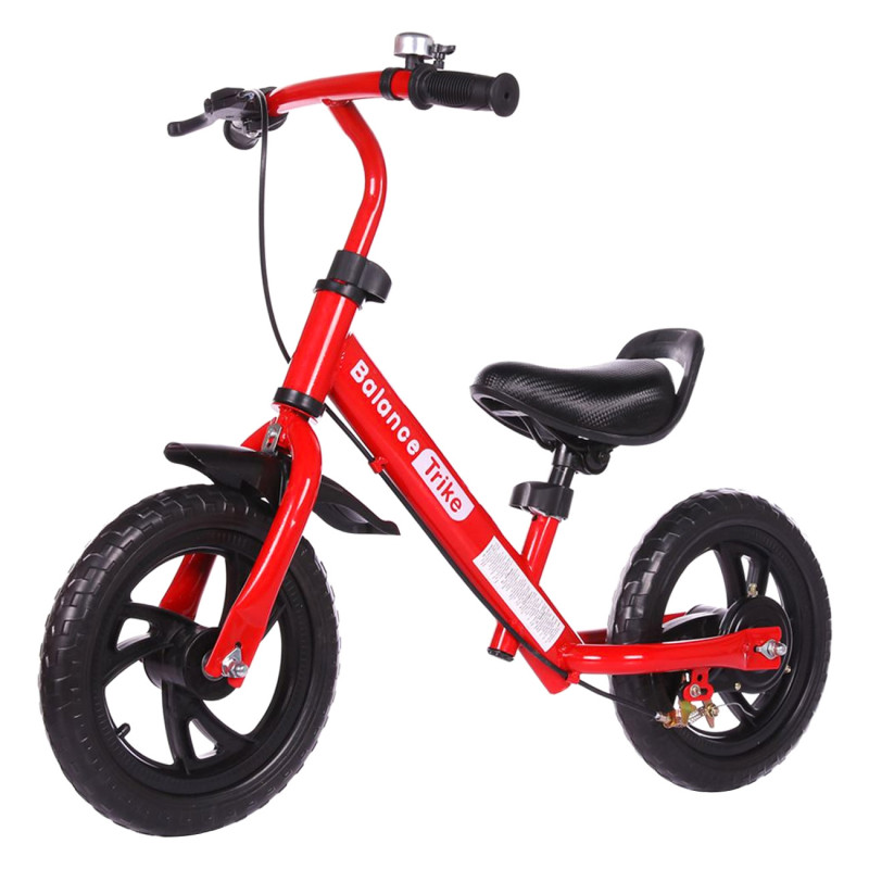 Детски велосипед за баланс без педали с метална рамка в червен цвят.