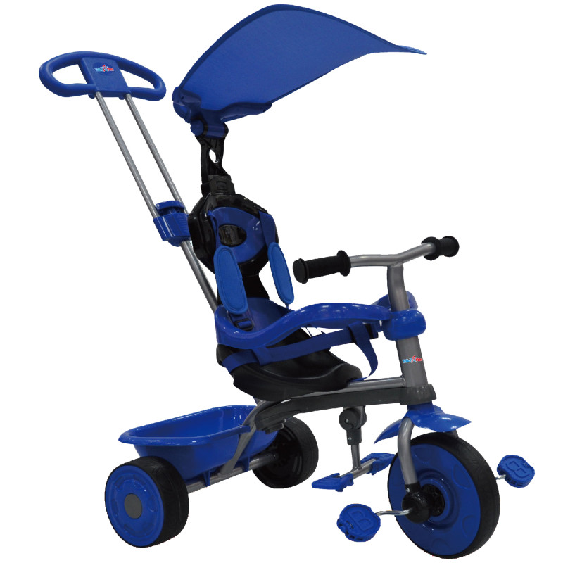 Детски велосипед тип триколка с педали, подвижен сенник и регулируема дръжка, изработен от метал и здрава пластмаса в син цвят.