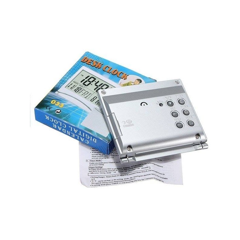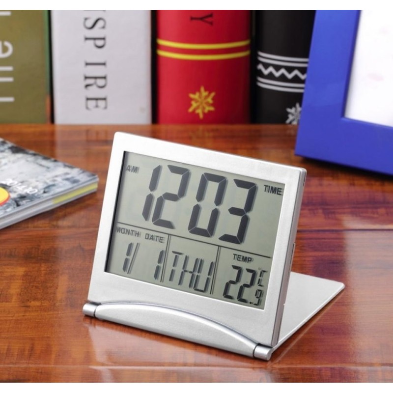 Настолен дигитален часовник с будилник, календар и термометър. Разполага със сгъваем дизайн, който позволява да се пренася лесно навсякъде с Вас или да се поставя на равно място.