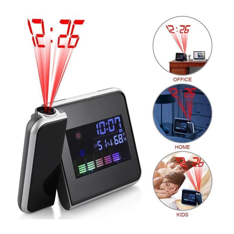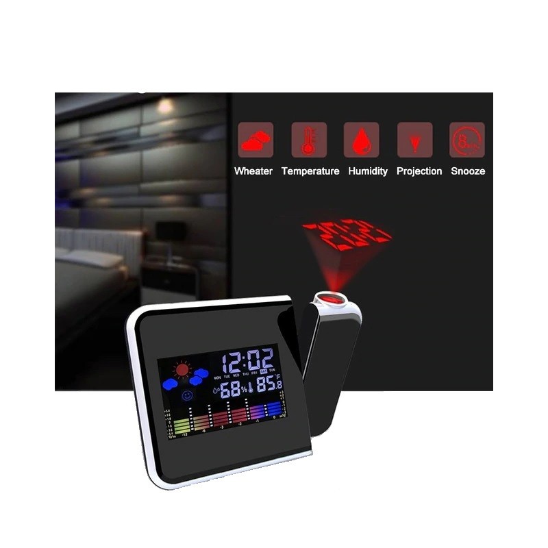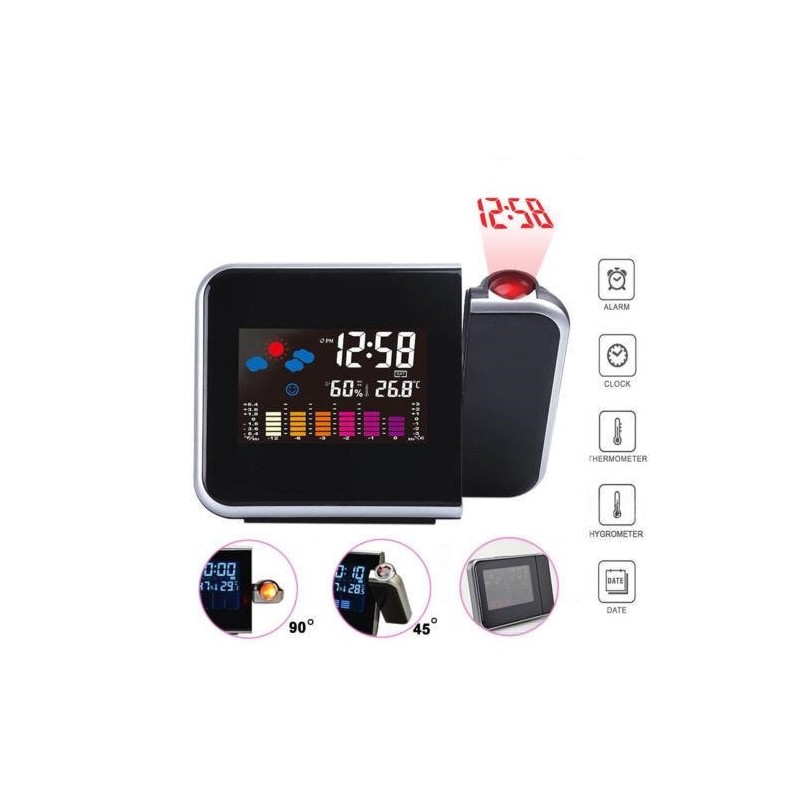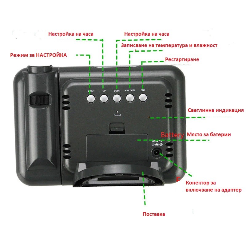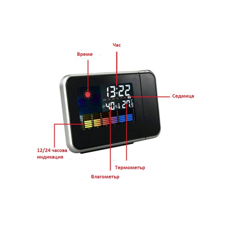 Иновативен часовник с LCD дисплей, термометър и календар. Притежава функция за прожектиране часа на тавана посредством лазерна холограма. Излючително ефектно и удобно особено през нощта.