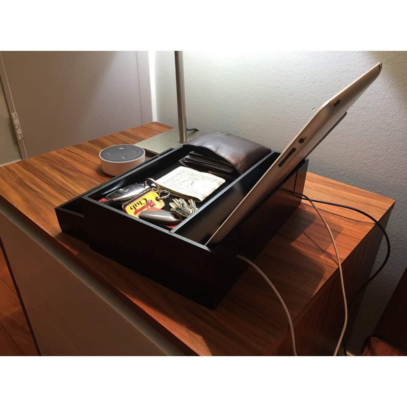 Разполага с отделение за поставяне на таблет и зареждане на телефон. Проектирахме органайзера, така че USB кабелите Ви за зареждане никога няма да паднат или да се заплетат! Притежава вградени дупчици за Вашите USB кабели и зарядни устройства. Може да зареждате до 4 устройства едновременно.