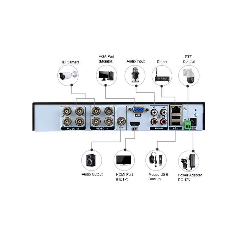 Рекордерът е най-новата технология и най-важната част от комплекта. Той разполага със софтуер за компресия на видео H.264 за кристално чисто изображение и бърз трансфер на данни по мрежата, автоматично започва запис при локализиране на движение, VGA и HDMI изход за гледане офлайн на екрана на компютъра, запис на функции, презентация и съхранение на записан материал (архивиране). Свържете монитора към рекордера и веднага ще разберете, че комплектът е сериозно звено за наблюдение и запис. Със софтуерната платформа CMS и мишката (включени в комплекта) можете да направите комплекта истинска контролна конзола. Общият контрол е в ръцете ви.