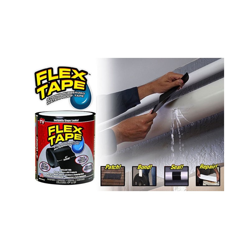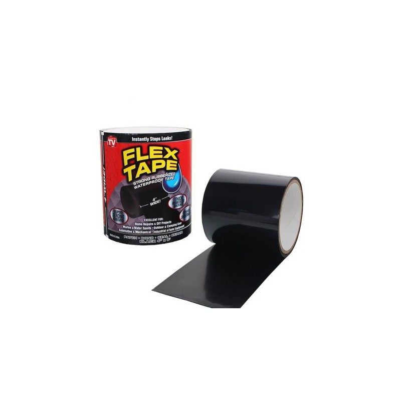 Flex Tape е силна, гумирана, водоустойчива лента, която може да залепва, запечатва и ремонтира почти всичко. Спира незабавно течове. Тя се захваща за повърхността супер стегнато и я облицова като създава моментално силно водоустойчиво уплътнение. Толкова е силна, че дори работи под вода. Flex Tape все едно се заварява върху повечето повърхности.