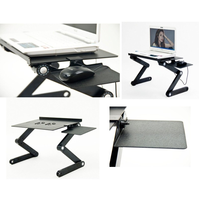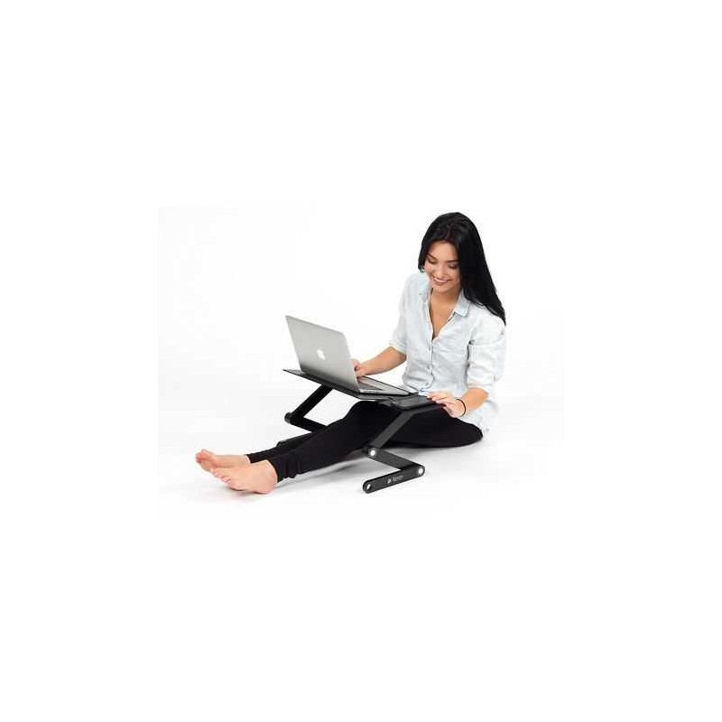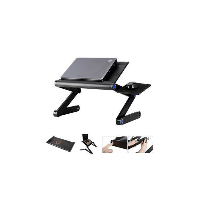 Лаптоп маса Т8 от алуминий с крака, въртящи се на цели 360 градуса. Масата е много компактна и лекичка. Краката, които самостоятелно се завъртат на 360 градуса я правят наистина удачна за всяка поза на тялото, както и за поставяне навсякъде, където ще използвате компютъра си и едновременно е здрава и стабилна към повърхността, върху която е позиционирана.