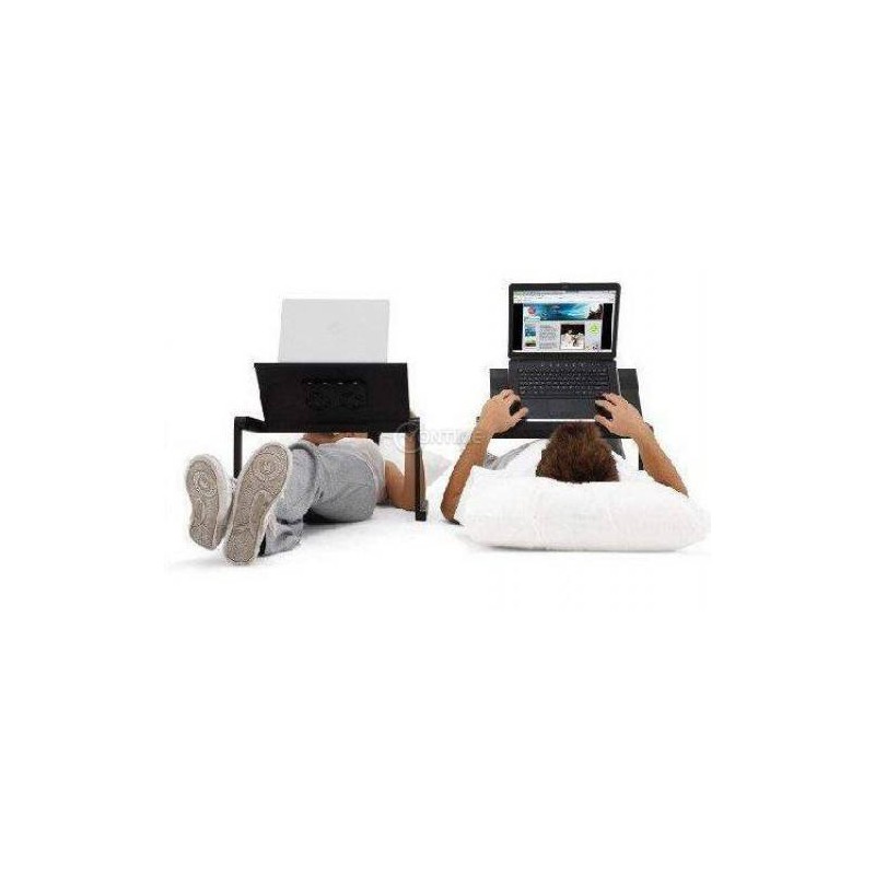 Масичката за лаптоп разполага с 2 на брой вентилатора за охлаждане, които са изключително безшумни. Захранват се чрез USB портовете на лаптопа и предпазват лаптопа от прекомерно нагряване. Устройството може да се ползва за преносими компютри с всякакъв размер. Комплектът съдържа и подложка за мишка, направена от алуминий, чийто монтаж е лесен, а ъгълът на поставяне е регулируем. Масичката за лаптоп е най-вече удачна за употреба в леглото, докато се храните, а с нейна помощ може да четете и книга. Тази подложка за лаптоп с крачета е удачна и за бременните дами, защото ще им осигури необходимия комфорт при ползване.
