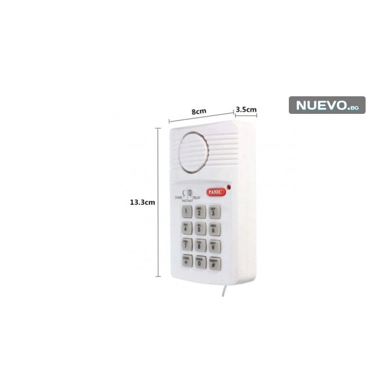 3 x AA батерия (не е включена в комплекта) .3 настройки: Instant, Delay & Chime. Настройка на забавяне: 10 секундно закъснение за въвеждане на защитен код, преди да се чуе 110 децибелова сирена