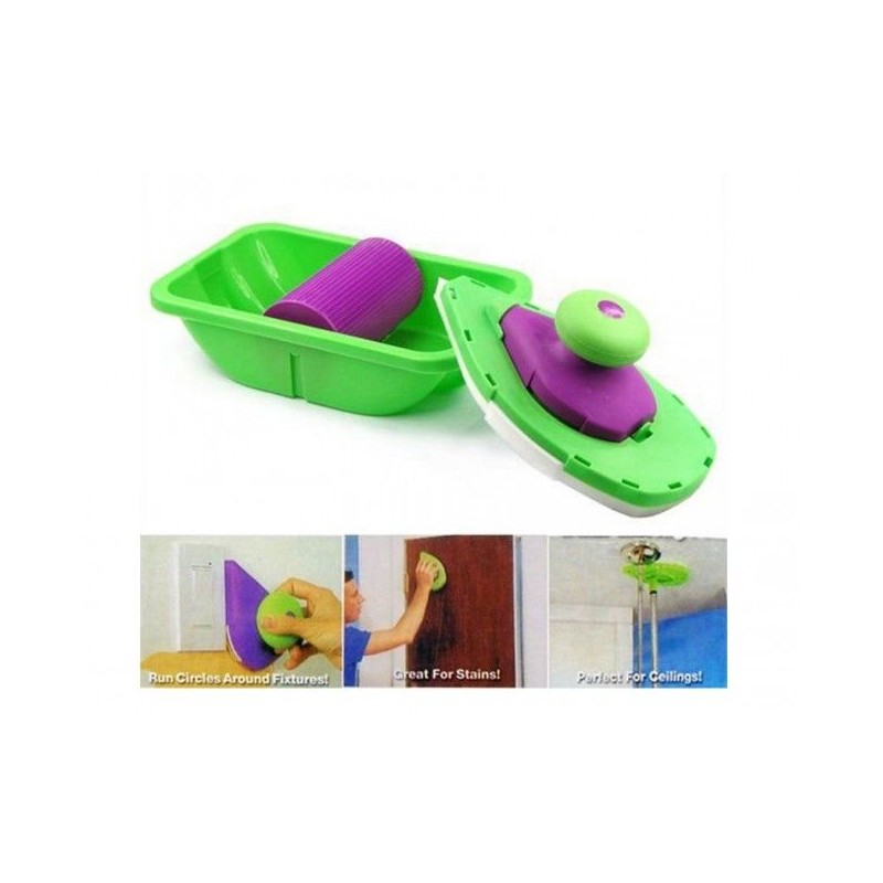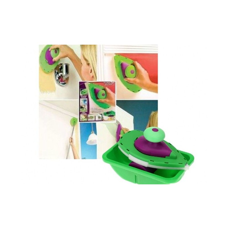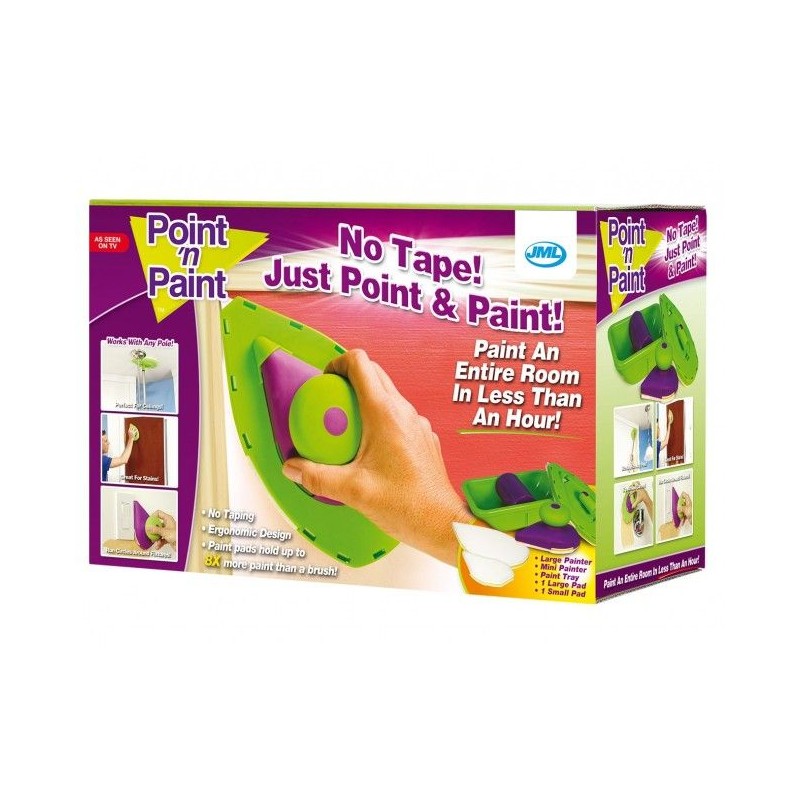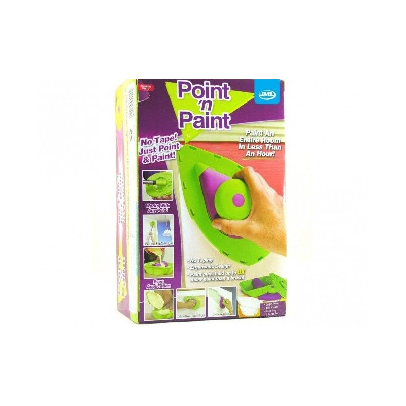 POINT AND PAINT e най-новият високотехнологичен и хитър помощник на домашния бояджия. Комплектът е съставен от 2 "валяка" - дунапренени четки с форма на ютия, които много удобно боядисват постранството до ъгъл без помощта на тиксо и помощни материали. ПРОСТО ОТСИЧАТ без да внимавате, без опастност от теч, подливане или изцапване на тавана. Двете "четки" поемат нужното количество боя от специално констроираната роторна ваничка, която разпределя перфектно съдържанието и количеството боя по четката. Голямата "четка" има чупещо във всички посоки рамо за завиване на удължител с диаметър 2 см. (удължителя, (пръчката),не включен в комплекта).