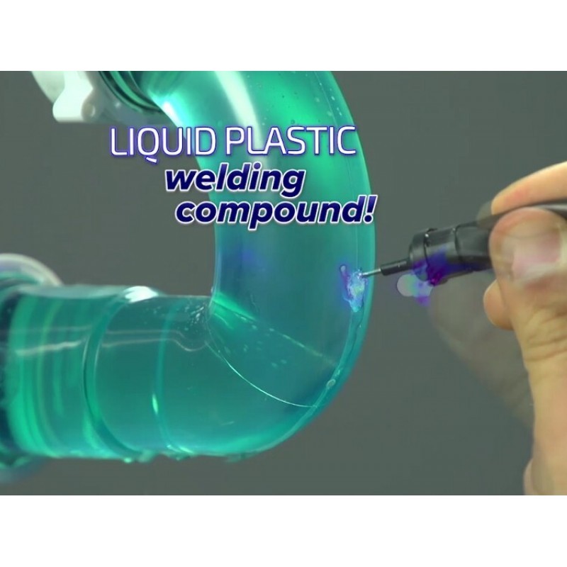Системата е по-точно за заваряване с течна пластмаса, активираща се с ултравиолетова светлина. Нанесете течната пластмаса на повърхността за заваряване, наместете детайлите, докато не активирате с ултравиолетова светлина течността не се втвърдява. Активирайте и готово. За по-малко от 5 секунди. Гъвкава, може да се шкури и боядисва. Създава здрава и постоянна връзка, спира течове и пълни пукнатини. Подходящо за пластмаса, метал, плат, дърво, стъкло, играчки, бижута, кабели и много други.