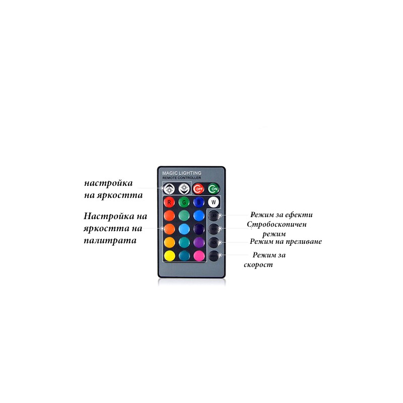 В комплекта има дистанционно управление, с което лесно ще можете да я загасите, смените цвета на осветлението или просто си направите мини дискотека.