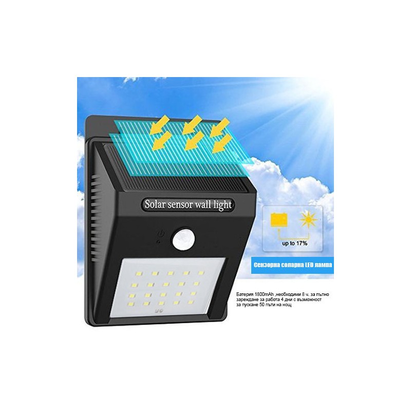 Нов актуализиран голям поликристален слънчев панел за ефективно (17% ефективност повече) и бързо (само 6-8 часа) презареждане. Голям капацитет. Продължителност на живота на слънчевия панел: 5 години; LED 20 живот - 50000 часа