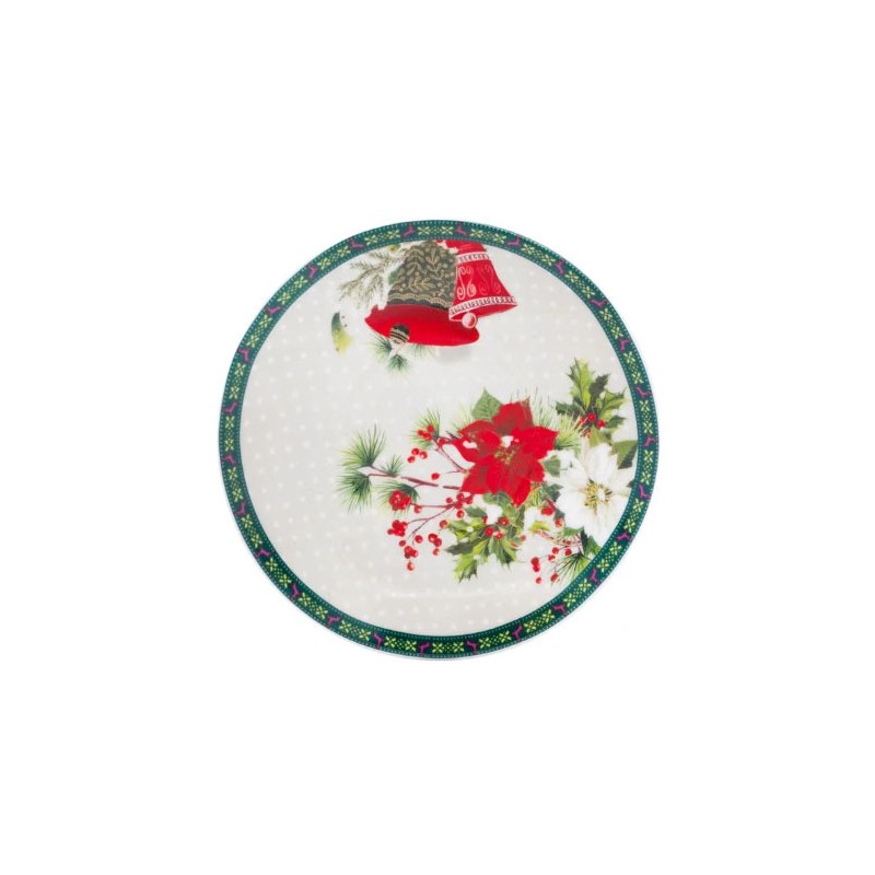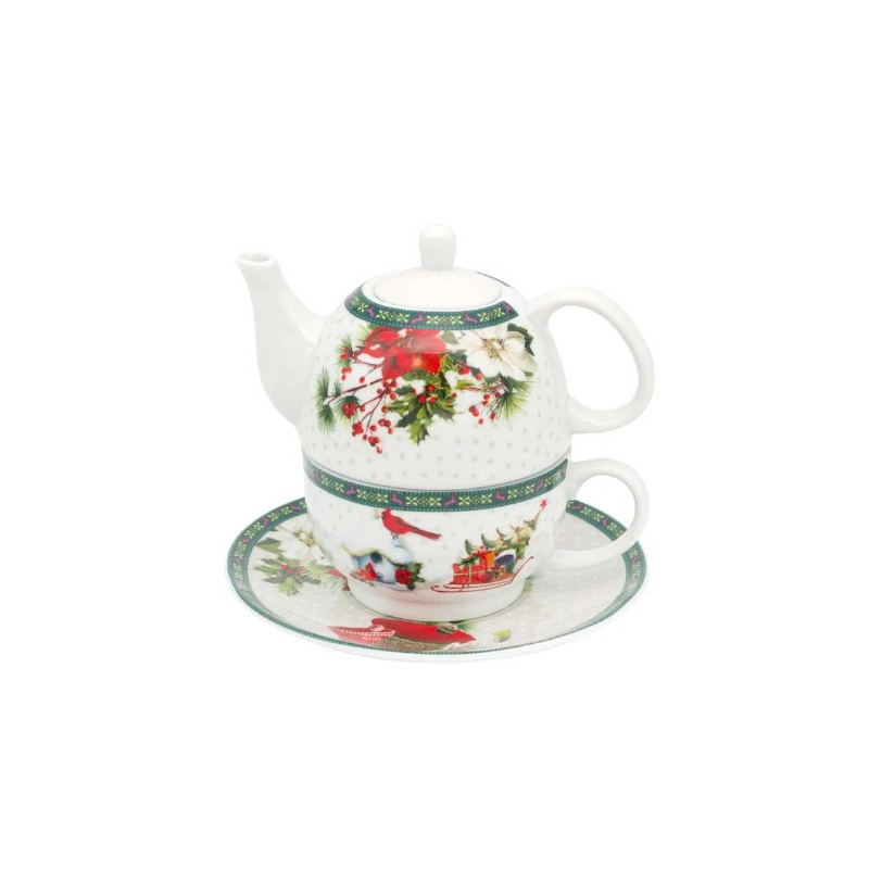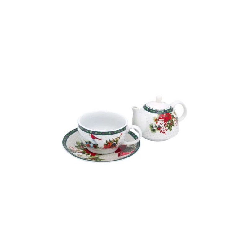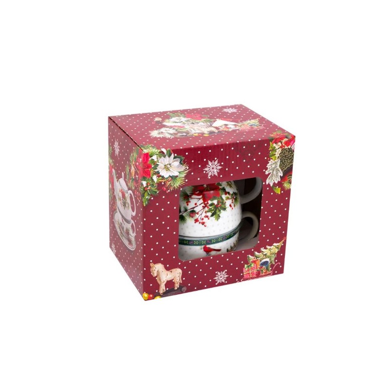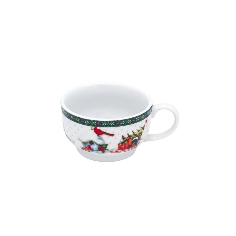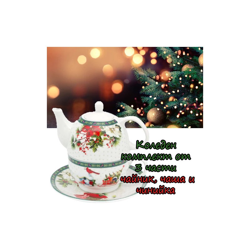 Коледен порцеланов комплект с чаша и бяла чинийка с коледна шарка.