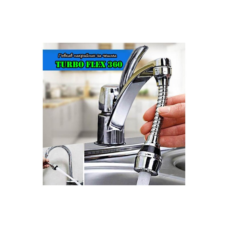 Turbo Flex 360 e 15 сантиметров гъвкав накрайник за смесител, благодарение на който ще намалите времето за миене на съдове наполовина.