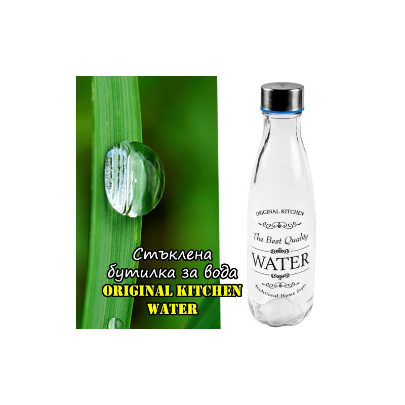 Страхотна стъклена бутилка за вода с надпис “Water”.