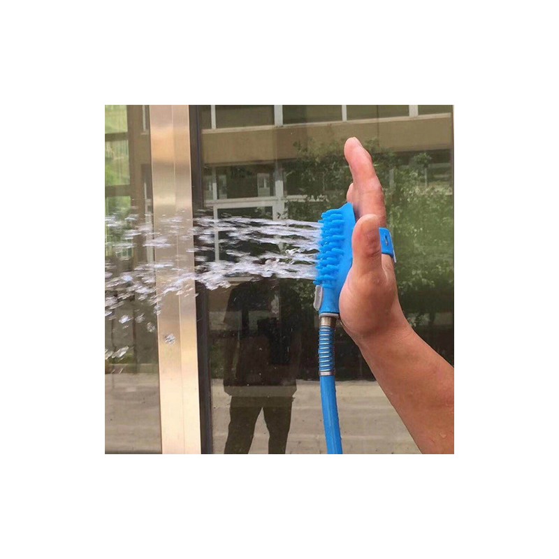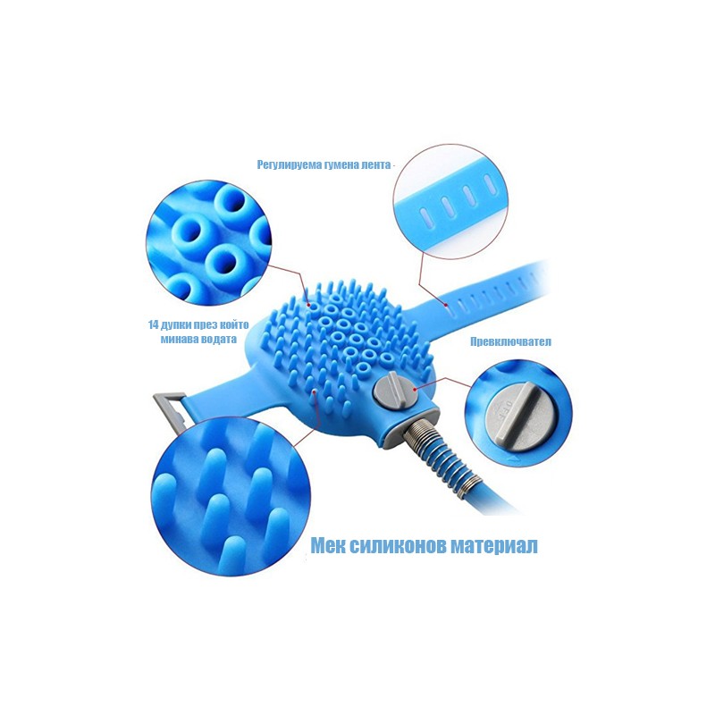 Може да контролирате пускането на водата с практичен колелообразен превключвател. Тази удобна четка за домашни любимци има регулируема каишка за ръка, която улеснява измиването и сресването.