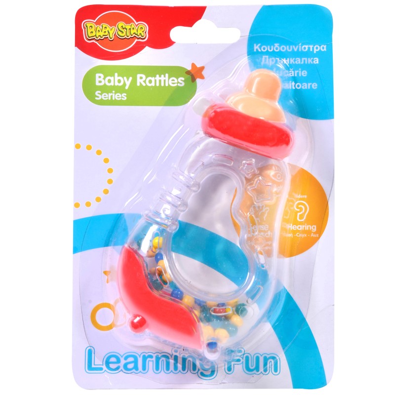 Формата и размерите на дрънкалката са удобни за хващане от бебешките ръчички, а цветните топчета ще провокират интереса на бебето.